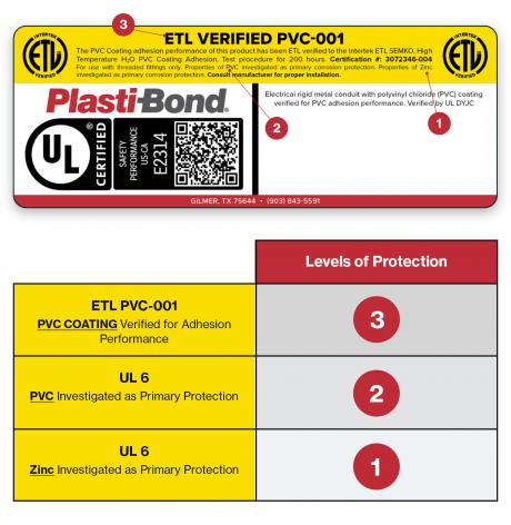 Here is an example of the ETL PVC-001 label. In order to ensure performance when specifying products for corrosive environments, select those that carry an independent product testing label, such as the ETL Verified Mark. When it comes to safety, make sure the PVC coated conduit being used carries the UL listing, where both the PVC and Zinc are listed as primary protection.